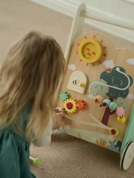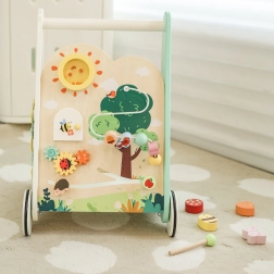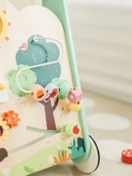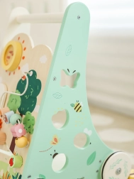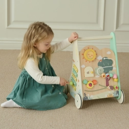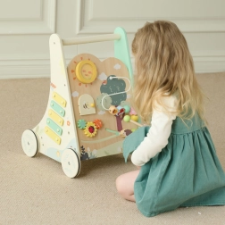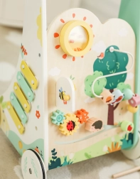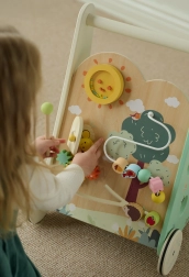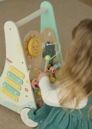 Chodítko rastie spolu s dieťaťom: od podpory pri chôdzi až po samostatnú hru s aktivitami, ktoré rozvíjajú jemnú motoriku, koordinačné schopnosti, sluch a logické myslenie. Povrchy sú ošetrené zdravotne nezávadnými farbami v jemných, lákavých odtieňoch.