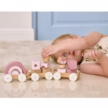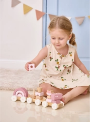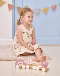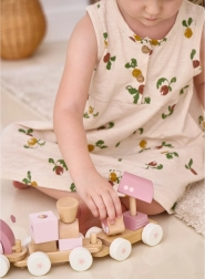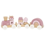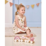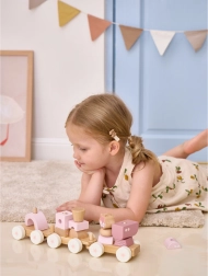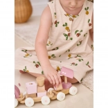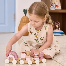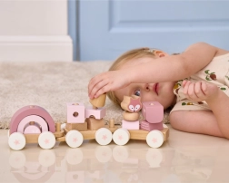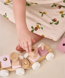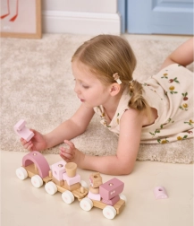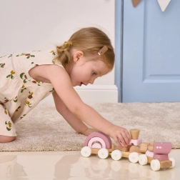 Drevený vláčik PolarB v nežných ružových a prírodných odtieňoch ponúka nekonečné možnosti hry. Deti môžu spájať vagóny, stavať originálne kombinácie kociek alebo sa s jednotlivými dielmi hrať samostatne. Praktické tvary sa dobre držia v malých rúčkach a podporujú zručnosť aj fantáziu.