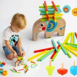 Slon z masívneho dreva slúži ako zábavná základňa na vyvažovanie a stavanie. Deti trénujú trpezlivosť, rovnováhu a presnosť pri ukladaní farebných tyčiniek.