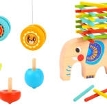Táto pestrá 46-dielna drevená sada kombinuje niekoľko obľúbených hier do jedného balenia. Deti môžu vyvažovať tyčinky na chrbte slona, stavať vežu či studňu, hrať mikádo, trénovať triky s dvojicou jój a merať, čie káča sa bude točiť dlhšie. Ideálna na samostatnú hru aj rodinné súťaženie.