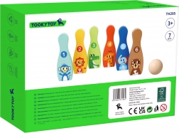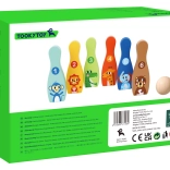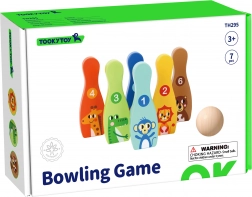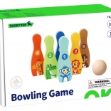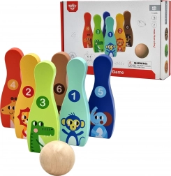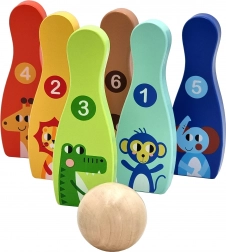 Drevená bowlingová sada so šiestimi farebnými kolkami a mičom je ideálnou hrou do detskej izby. Každá kolka má zvierací motív a číslovanie 1–6, vďaka čomu deti pri hre prirodzene trénujú počítanie, poznávanie farieb a rozvíjajú motorické zručnosti.