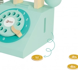 Tento drevený telefón v klasickom štýle prináša deťom autentický zážitok z hrania. Vďaka otočnému číselníku, slúchadlu na šnúre a hre s vkladaním mincí sa deti učia viesť rozhovor, rozvíjajú sociálne zručnosti a precvičujú koordináciu oko–ruka. Bez batérií – ozve sa príjemný mechanický zvonček.