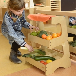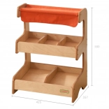 Drevený trhový stánok Masterkidz s materiálovou strechou ponúka dvojúrovňovú konštrukciu pre maximálnu flexibilitu. Na prvej úrovni nájdete tri komory, ideálne pre rôzne druhy produktov.
