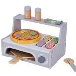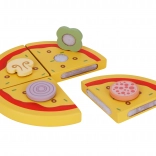 Pizza set obsahuje odnímateľné kúsky pizze a rôzne prísady, ktoré vyzývajú k tvorbe a zdobeniu.