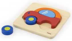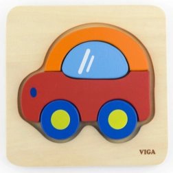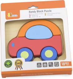 Drevený blokový puzzle v tvare auta, značka VIGA, ponúka odolnosť a farebnú príťažlivosť.