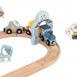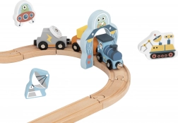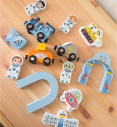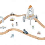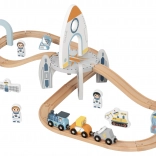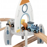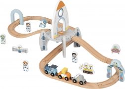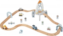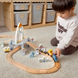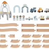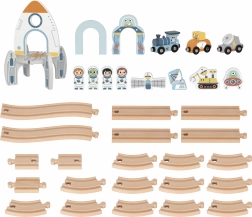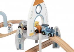 Táto drevená kozmická vláčikodráha vtiahne deti do sveta vesmíru s tematickými prvkami, ako sú figúrky astronautov, kozmická sonda, rover a lietajúci tanier. Viacúrovňové usporiadanie dráh dodáva hre dynamiku. Centrálna časť dráhy je veľká kozmická raketa, ktorá slúži ako dekoratívny i konštrukčný prvok.