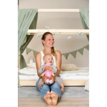 Ružový overal zdobí výšivka roztomilého zvieracieho kamarátka a zladená čiapočká s kvetinovou potlačou. Bábika sa ľahko drží malými rúčkami, je ideálna do kočíka, do postieľky aj na cesty. Praktická údržba poteší rodičov – hračku možno jednoducho vyprať v ruke na 30 °C.