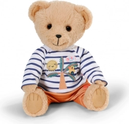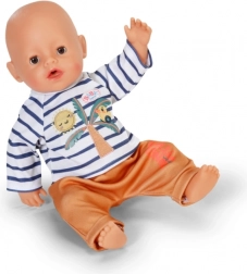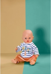Štýlový set pre bábiky BABY born a medvedíka BABY born Teddy vyniká pohodlím a hravým dizajnom. Obsahuje pruhované tričko s dlhým rukávom s motívom palmy a slniečka a oranžové nohavice s potlačou. Oblečenie je vhodné pre bábiky s veľkosťou 43 cm a vďaka mäkkým materiálom sa ľahko oblieka. Súčasťou je ramienko z recyklovaného materiálu. Ideálne na kreatívnu hru, ľahké prezliekanie a dlhotrvajúcu zábavu.
