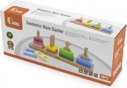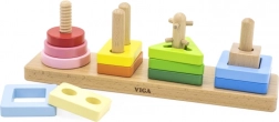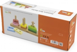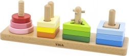 Drevený geometrický triediaci prvok od značky Viga je edukačná hračka určená na výučbu počítania a rozlišovanie tvarov a farieb. Na každú zo štyroch základných tyčiek je potrebné umiestniť zodpovedajúce tvary. Zábava, ktorá sa na prvý pohľad zdá jednoduchá, je sťažená tým, že je potrebné kocky prispôsobiť zodpovedajúcim výčnelkom. Počas hry dieťa rozvíja manuálne zručnosti, koordináciu ruka-oko a logické myslenie. Sýte farby priťahujú pozornosť dieťaťa a stimulujú jeho zmysly. Triedič je bez ostrých hrán a použitie netoxických farieb zaručuje bezpečnosť pre deti aj životné prostredie.