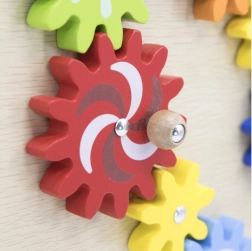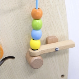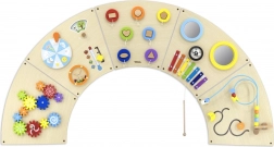 Táto kvalitne spracovaná nástenná tabuľa v podobe polkruhu prináša deťom pestrý svet objavovania: ozubené kolesá, bludiská, korálkovú dráhu, tvary na priraďovanie, hudobné prvky (cimbal, gong), zrkadlá, „počasie“ a „ročné obdobia“, disk na roztočenie či teplomer. Vďaka robustnému upevneniu na stenu šetrí miesto a podporuje koordináciu oko–ruka, rozpoznávanie farieb a tvarov aj logické uvažovanie.