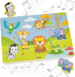 Objavte svet džungle so zvukovým dreveným puzzle Viga. Dieťa po správnom vložení dielika začuje realistický zvuk zvieraťa, čo podporuje učenie hrou. Hračka rozvíja jemnú motoriku, koordináciu ruka-oko a vnímanie zvukov. Vďaka pomocným ilustráciám sa deti ľahšie naučia správne priraďovať tvary.