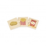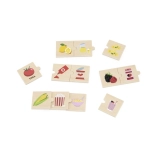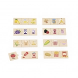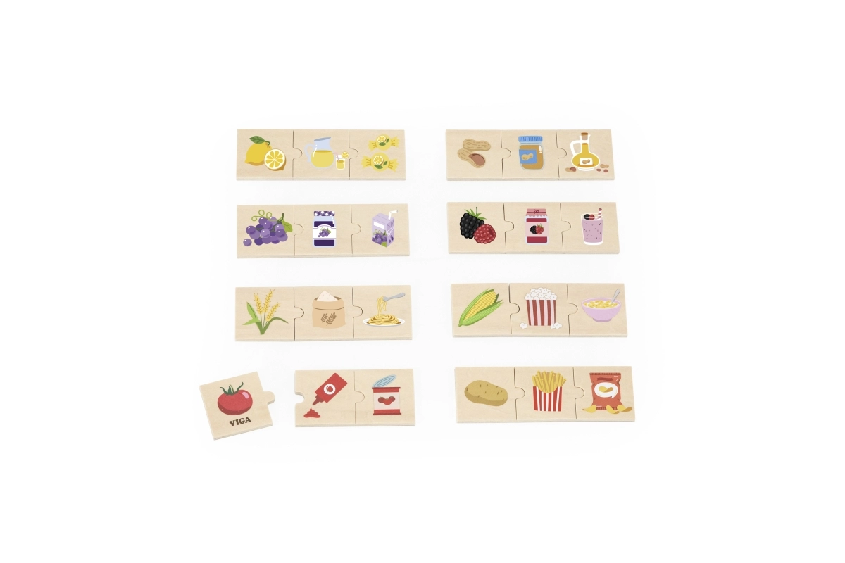 Tento kvalitný drevený set predstavuje jednoduché skladačky, ktoré prepájajú surovinu s jej spracovaným produktom. Deti sa zábavnou formou učia, odkiaľ pochádzajú ich obľúbené pochúťky – napríklad zemiak a hranolky, citrón a limonáda, kukurica a popcorn alebo hrozno a hroznový džem/šťava.