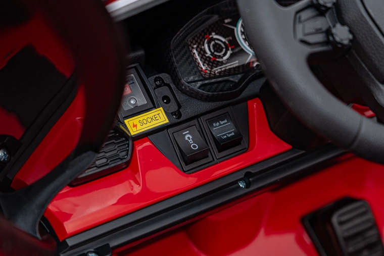 Interiér poteší dvojitým sedadlom z eko kože s bezpečnostnými pásmi, realistickým volantom, pedálmi a prehľadným ovládacím panelom. Deti nadchne audio výbava – FM rádio, MP3, USB, AUX a Bluetooth, vrátane prednahraných melódií a klaksónu. Otváracie nožnicové dvere a plne funkčné LED osvetlenie podčiarkujú prémiový vzhľad.