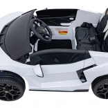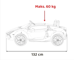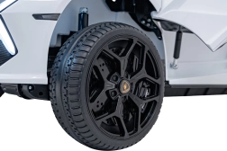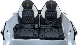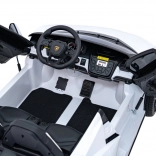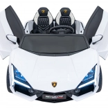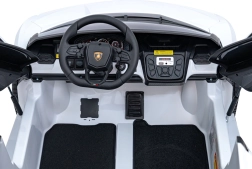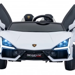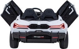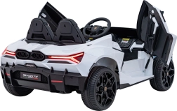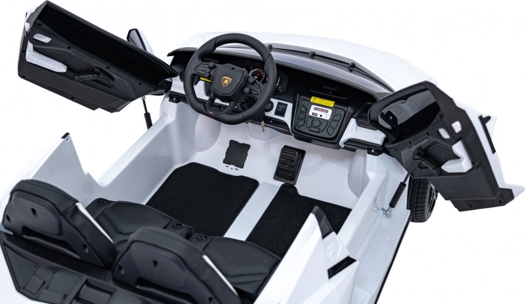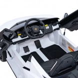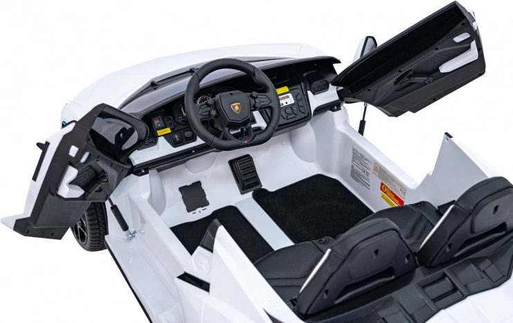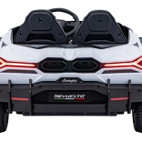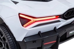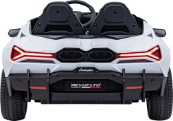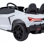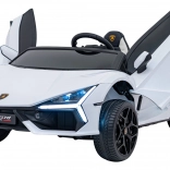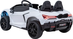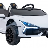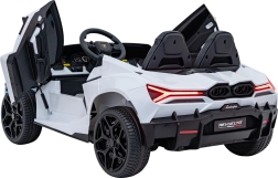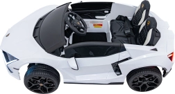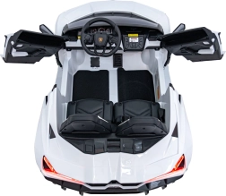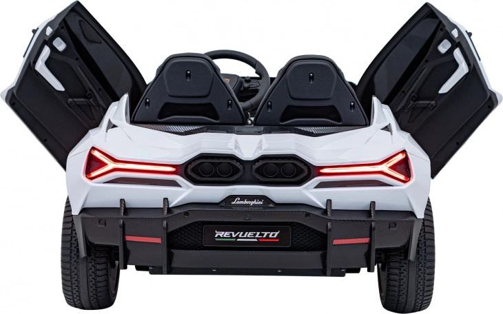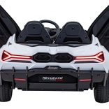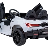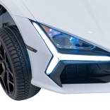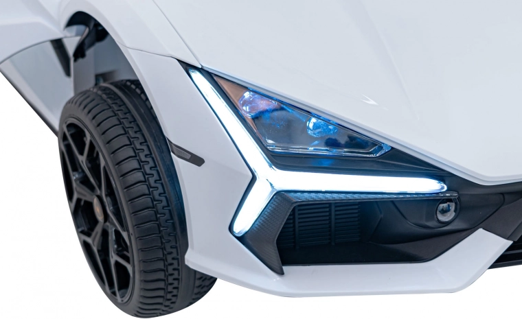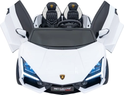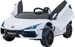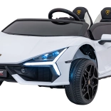 Luxusné detské elektrické auto LAMBORGHINI REVUELTO XL v bielej farbe ponúka silný pohon 4x200 W, batériu 24 V / 7 Ah, dve sedadlá z eko kože s pásmi a LED svetlá vpredu aj vzadu. Súčasťou je 2,4GHz diaľkové ovládanie s bezpečnostným tlačidlom Stop, bohatý audio panel (FM rádio, MP3, USB, Bluetooth, AUX) a efektné výklopné dvere typu scissor pre autentický zážitok z jazdy.