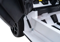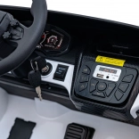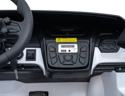 Rodičia ocenia diaľkové ovládanie 2,4 GHz s 3 rýchlosťami a núdzovým tlačidlom Stop. Deti sa zabavia pri multimediálnom paneli s FM rádiom, Bluetooth, USB, MP3 a vstupom AUX. Dvojité sedadlo z eko kože s bezpečnostnými pásmi poskytne komfort aj dvom jazdcom, praktický ukazovateľ nabitia postráži stav batérie a otváracie scissor dvere dotvárajú autentický zážitok.