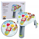 Podporte prirodzený rozvoj detí vďaka všestrannej hračke, ktorá motivuje k objavovaniu. Interaktívny telefón s farebnými tlačidlami po vložení batérií prehráva rôzne zvuky a melódie, čím podnecuje zvedavosť a zmyslové vnímanie. Na doske stolíka nájdete tlačidlá, otočné prvky, posúvače a edukačné kocky na učenie farieb a tvarov.