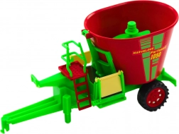 Červeno-zelený kŕmny voz s otočným miešacím bubnom napodobňuje skutočné poľnohospodárske zariadenie a rozširuje herné scenáre.