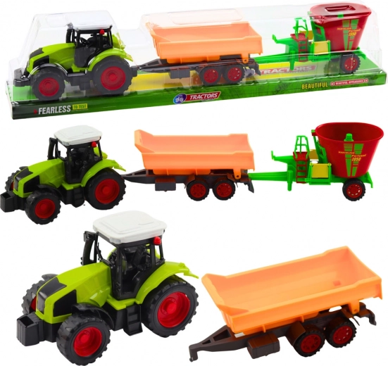 - Zelený traktor, oranžový príves (vyklápací), červeno‑zelený kŕmny voz