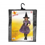 Doprajte malej kúzelníčke outfit, v ktorom zažiari na každej párty. Fialovo-čierne šaty so zlatými bodkami, nariasenými rukávikmi a výraznou sukňou vytvárajú očarujúci vzhľad, ktorý upúta pozornosť. Súčasťou je aj zladený klobúk, vďaka ktorému je kostým kompletný a pripravený na okamžité nosenie.