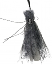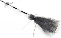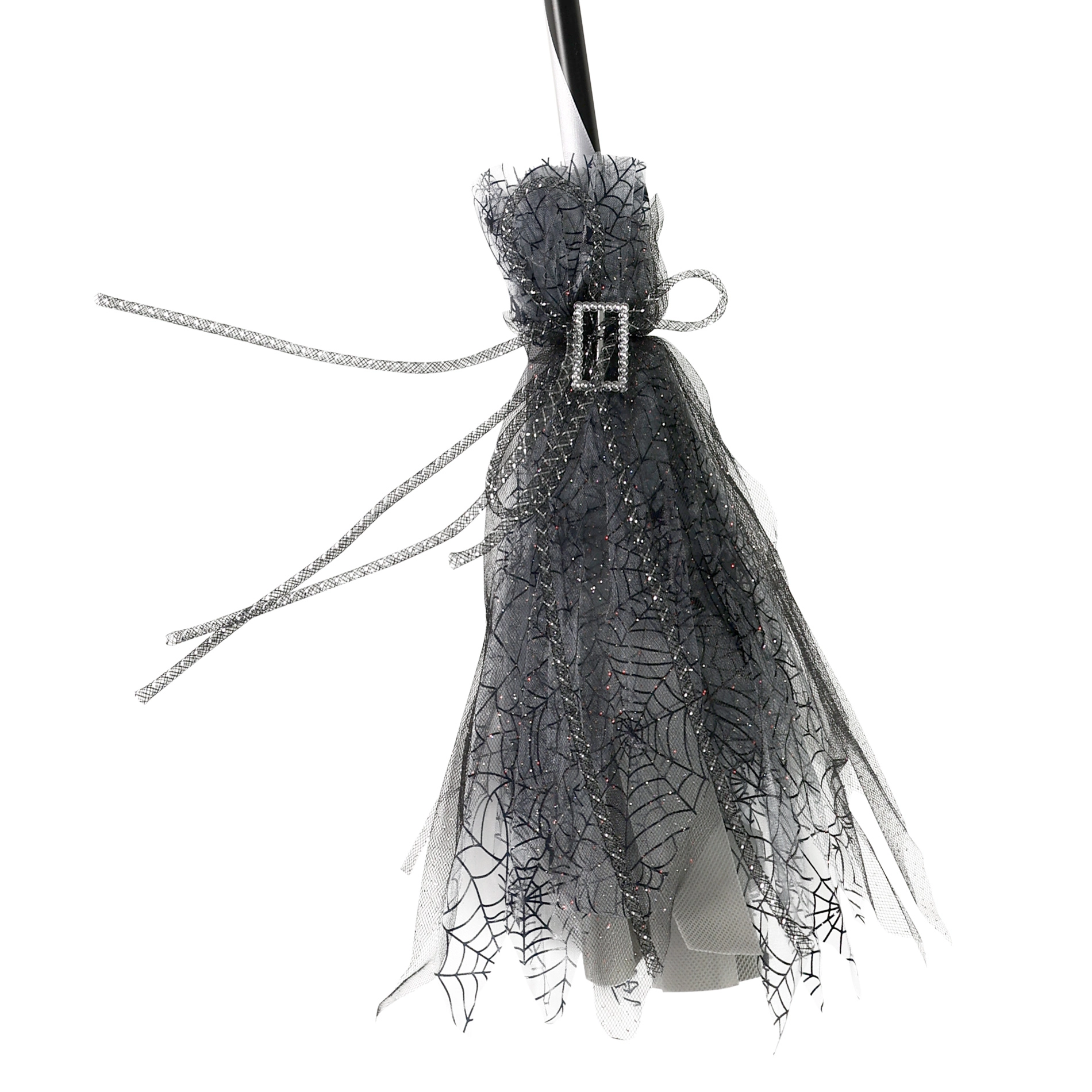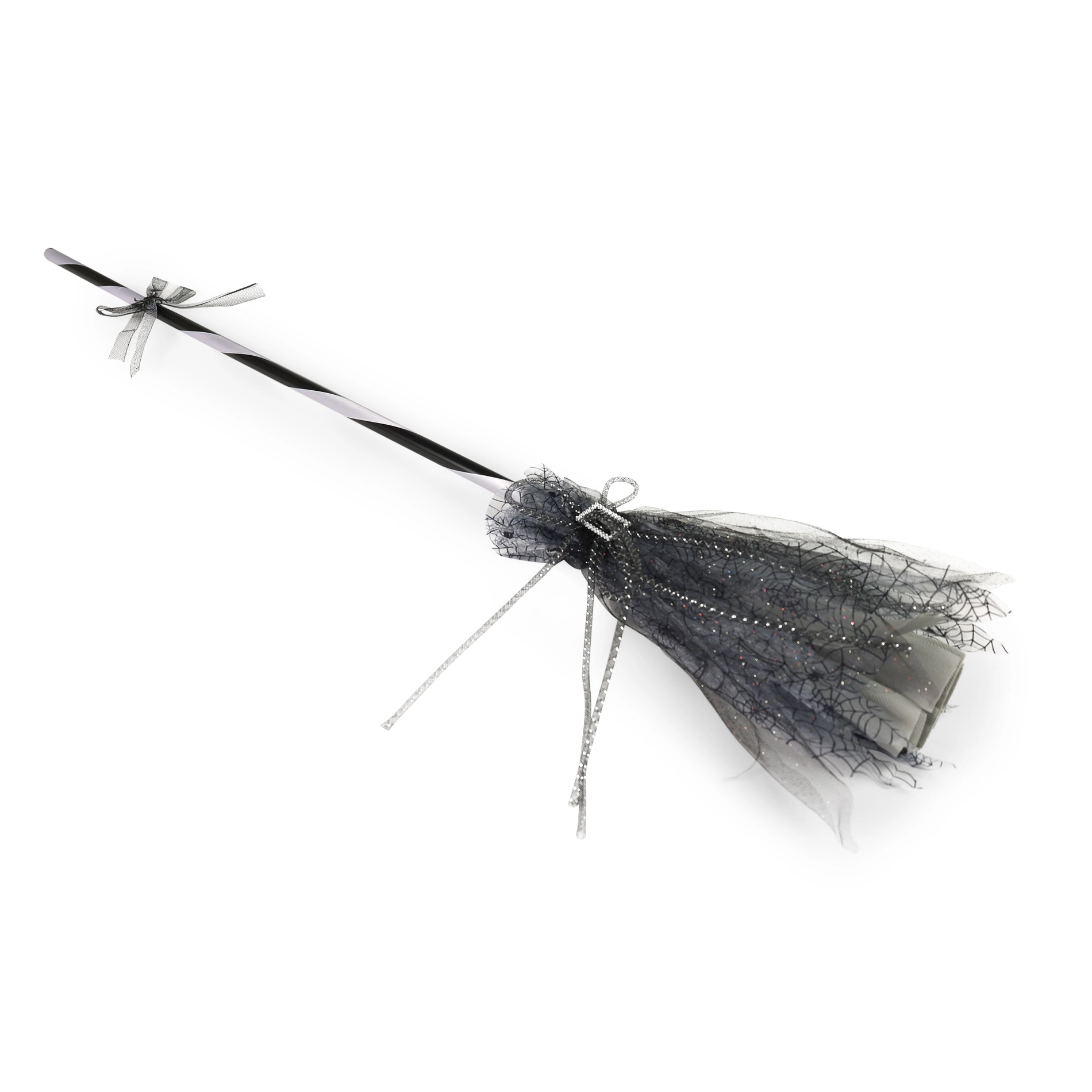 Dodajte svojmu čarodejníckemu kostýmu dokonalú bodku. Táto čarodejnícka metla s elegantným čierno‑sivým prevedením, zdobená striebornou sponou a jemnou tylovou „sukničkou“, pôsobí efektne pri každom kroku. Je ľahká do ruky, takže sa s ňou dobre pózuje aj tancuje na parkete.