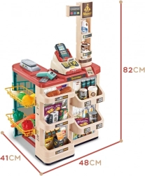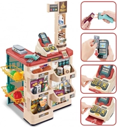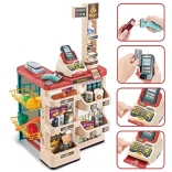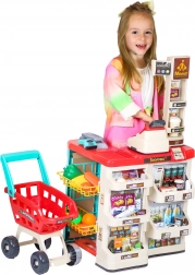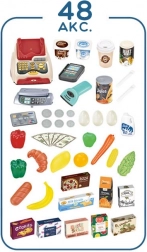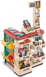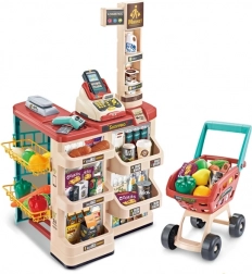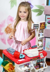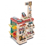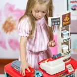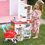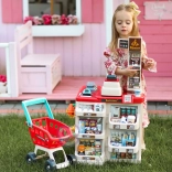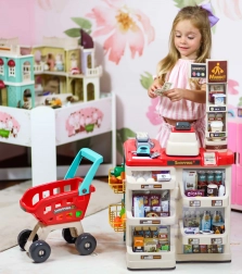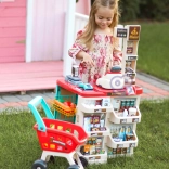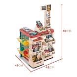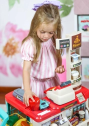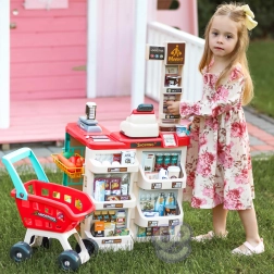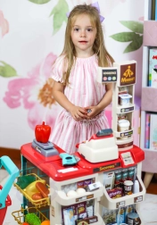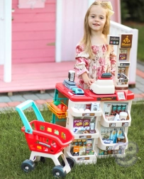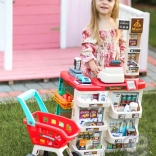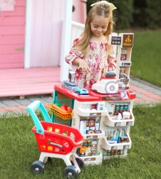 Premyslené usporiadanie s policami a cenovkami podporuje učenie o hodnote peňazí, počítanie a základnú finančnú gramotnosť. Realistické potraviny (ovocie, zelenina, nápoje, mliečne výrobky a i.) podnecujú predstavivosť a konverzáciu, zatiaľ čo odolné plastové vyhotovenie sa hodí do každej detskej izby.