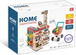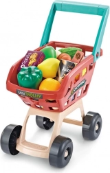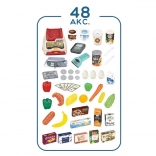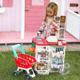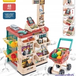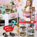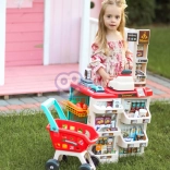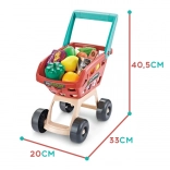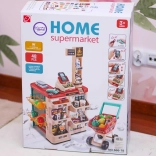 Súčasťou je stabilný vozík a 48 doplnkov: ovocie, zelenina, nápoje, mliečne výrobky, papierové peniaze a platobná karta – všetko pre kompletný nákup.