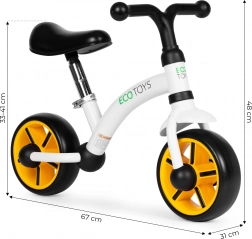 Odrážadlo ECOTOYS je skvelou voľbou pre prvé krôčiky k samostatnej jazde. Vďaka nízkej hmotnosti a smart konštrukcii deti prirodzene trénujú rovnováhu, koordináciu a istotu, čo uľahčí prechod na klasický bicykel. Práškom lakovaný oceľový rám zabezpečuje dlhú životnosť a moderný vzhľad, EVA kolesá sú tiché, odolné a nevyžadujú pumpovanie.