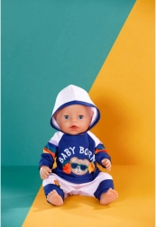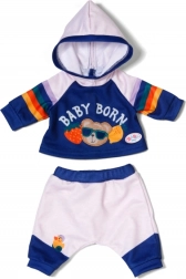 Doprajte svojej bábike štýl a pohodlie s touto mäkučkou teplákovou súpravou pre bábiky 43 cm. Mikina s kapucňou, dúhovo pruhovanými rukávmi a zábavným motívom BABY BORN sa skvele kombinuje s pohodlnými nohavicami. Oblečenie je navrhnuté tak, aby ho deti ľahko zvládli obliecť aj vyzliecť.