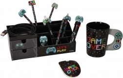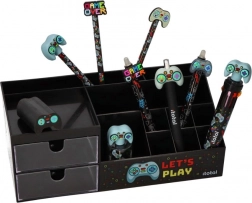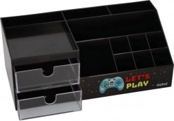 Udržte svoj stôl dokonale prehľadný s týmto štýlovým organizérom v čiernej farbe s motívom LET’S PLAY. Kombinuje dve priehľadné zásuvky a viac priehradiek na ceruzky, káble, drobné príslušenstvo alebo herné gadgety. Odolné plastové prevedenie a hravý gamingový dizajn skvelo zapadne do pracovne, študentskej izby aj herného kútika.