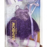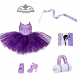 Purpurové šaty s tutu sukňou, ladiace topánky a stuha RAINBOW vytvoria nezabudnuteľný baletný štýl vašej bábiky.