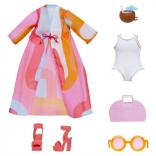 Štýlový set oblečkov a doplnkov pre bábiky RAINBOW HIGH prináša letný motív Deň pri bazéne. Nájdete v ňom farebné kimono, biele plavky, ružové sandáliky na podpätku, štýlovú kabelku, oranžové slnečné okuliare s logom a roztomilý kokosový nápoj. Vhodné pre všetky 11" bábiky RAINBOW HIGH a ideálne na mixovanie štýlov.