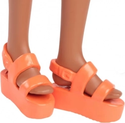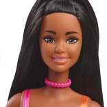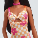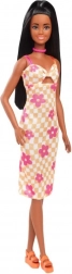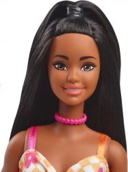 Nádherná vysoká bábika Barbie s dlhými čiernymi vlasmi čiastočne zopnutými, ozdobená ružovým chokerom a oranžovými platformovými sandálmi. Jej vzhľad dopĺňajú elegantné šaty s kvetinovým vzorom.