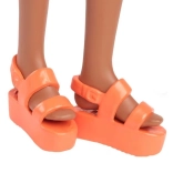 Jej vzhľad charakterizujú zábavné detaily, ktoré zdôrazňujú jej osobnosť, ako ružový choker a oranžové platformové sandále.