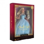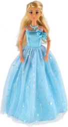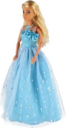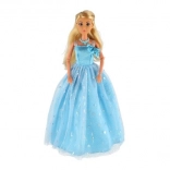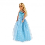 Bábika má dlhé modré šaty s jemným vzorom a trblietavými detailmi, ktoré zaujmú na prvý pohľad.