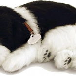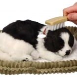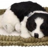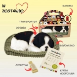 Detailná čierno‑biela srsť, obojok s plieškom a jemné „dýchanie“ počas spánku dodávajú šteniatku autentický dojem skutočného miláčika.