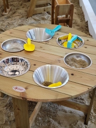 Každá z vložených misiek ponúka iný typ aktivity – od sitovania cez nalievanie až po miešanie a porovnávanie materiálov. Deti rozvíjajú jemnú motoriku a logické myslenie hrou.