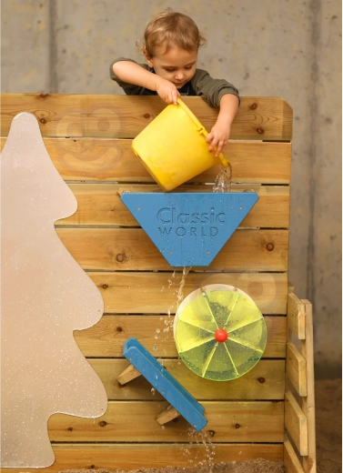 Táto drevená hra rozvíja jemnú motoriku, logické myslenie aj kreativitu. Deti môžu sypať piesok alebo liať vodu do lievikov, sledovať, ako prúd roztáča kolotoč a steká po žľaboch, a objavovať princípy príčiny a následku. Uprostred zaujme zrkadlová fólia v tvare stromčeka, ktorá podporuje zmyslové vnímanie.
