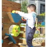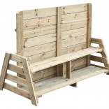 Konštrukcia je vyrobená z impregnovaného borovicového dreva, ktoré je odolné voči poveternostným vplyvom a bezpečne ošetrené netoxickým náterom. Zadná strana panelu obsahuje praktickú lavičku a spodnú policu na odkladanie hračiek – ideálne na krátky oddych medzi hraním.