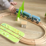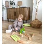 Diely možno kreatívne kombinovať – drevené bloky sa dajú stavať na seba a vytvárať domčeky okolo koľají. Kvalitné prírodné materiály (drevo s certifikáciou FSC, plsť z recyklovaného P.E.T.) sú odolné, príjemné na dotyk a šetrné k prírode. Ideálne na samostatnú hru aj spoločné objavovanie.