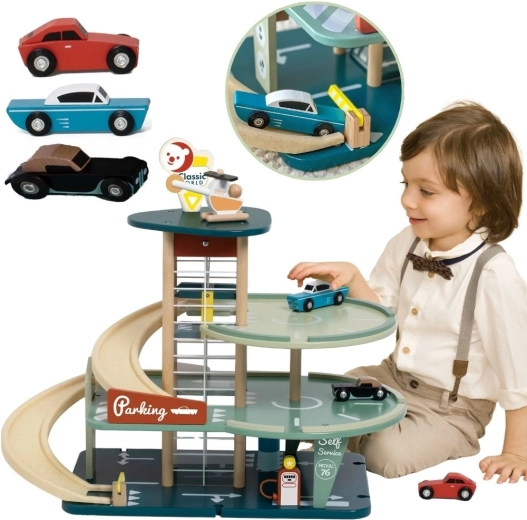 Objavte retro čaro zlatej éry automobilov. Toto viacposchodové drevené parkovisko ponúka plynulú prevádzku na všetkých úrovniach – deti vyvezú autíčka výťahovou šachtou, zídu po špirálových rampách, dôjdu k umývačke aj pumpe a pristávajú na strešnom heliporte. Robustná drevená konštrukcia s hladkými hranami je bezpečná a príjemná na dotyk.