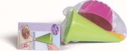 3-dielna sada na piesok Androni pre najmenších z kvalitného plastu, vyrobená v Taliansku. Obsahuje dekoračný miešací lievik na miešanie piesku a vody a tvorbu kreatívnych mafinov a báboviek, tvorítko v tvare bábovky a naberačku na kopčeky. Ľahká, bezpečná a vhodná od 10 mesiacov.