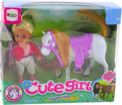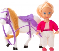 Obsah balenia: mini bábika v jazdeckom oblečení, biely kôň s dlhou hrivou a chvostom, fialové sedlo a uzda, jazdecký bičík.