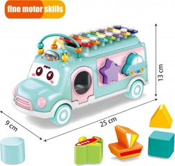 Hudobné autíčko má mnoho prvkov na manipuláciu a objavovanie. Dieťa môže použiť priložené kladivo na hru na farebnom xylofóne umiestnenom na streche vozidla. Na bokoch autíčka sú otvory rôzneho tvaru, pričom súčasťou sú farebné kocky, ktoré sa dajú do týchto otvorov vkladať. Táto hra pomôže dieťaťu rozvíjať koordinačné schopnosti a rozpoznávanie farieb a tvarov. Guľôčky na streche, ktoré môže dieťa posúvať, cvičia jeho zručnosť a sústredenie.