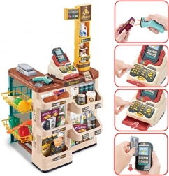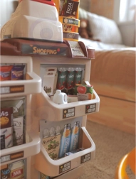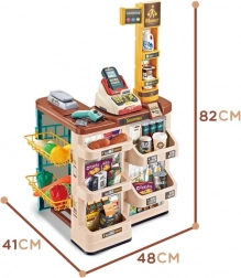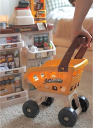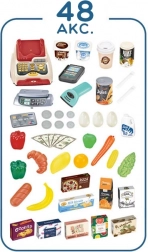 Súčasťou je košík/vozík a množstvo potravín ako ovocie, zelenina, mlieko či džús – všetko pre plnohodnotnú hru na obchod.