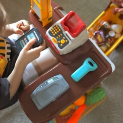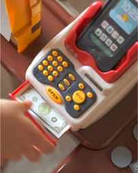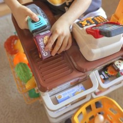 Pokladňa s výsuvnou zásuvkou na peniaze, čítačkou kariet a skenerom, ktorý svieti a vydáva zvuk, prináša deťom autentický zážitok z nakupovania.