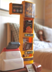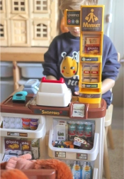 Mechanická váha verne napodobňuje tú skutočnú a policové usporiadanie s cenovkami pomáha deťom triediť, ukladať a učiť sa hodnotám.