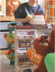 So setom Woopie supermarket deti objavujú svet nakupovania a základov počítania. Reálne prvky ako svietiaci a zvukový skener, pokladňa s výsuvnou zásuvkou a mechanická váha verne napodobňujú skutočný obchod. Stabilný pult so závesnými aj policovými miestami na tovar a prehľadnými cenovkami podporuje samostatnosť a organizáciu.