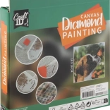 Obrázok sa postupne skladá na plátno potiahnuté lepiacou vrstvou. Je dôležité, aby ste lepiacu fóliu odstraňovali po častiach, čím sa zabráni znečisteniu povrchu a zabezpečí dobré priľnutie kamienkov.