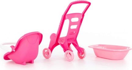 Súčasťou je kočík pre bábiky, autosedačka/nosič a malá vanička – všetko zladené do výraznej ružovej farby. Sada je ideálna na hranie rolí, učenie sa starostlivosti o bábätko a zábavu doma aj vonku.