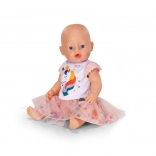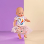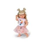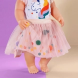 Doprajte svojej bábike magický štýl s jedinečnými tutu šatičkami s motívom jednorožca. Set tvorí biele tričko s krátkym rukávom a hravou potlačou jednorožca, doplnené ružovou tutu sukňou z tylu so skutočnými farebnými pomponmi pod vrchnou vrstvou. Kombinácia jemných materiálov a elastického pásu uľahčuje obliekanie a je pohodlná pri hraní.
